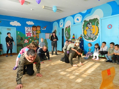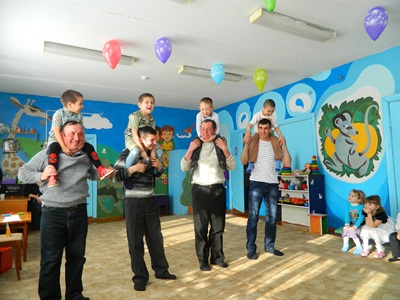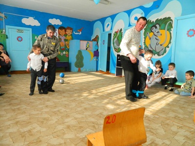 Затем несколько пап соревновались в быстроте, кто сильнее, крепче в следующих испытаниях: · Приседание с ребенком на плечах; · Бег на четвереньках с ребенком на спине; · "Игра в футбол” с завязанными ногами; · Подготовь ребенка в детский сад. В завершении праздника мальчикам были вручены подарки, высказаны слова поздравления. | |